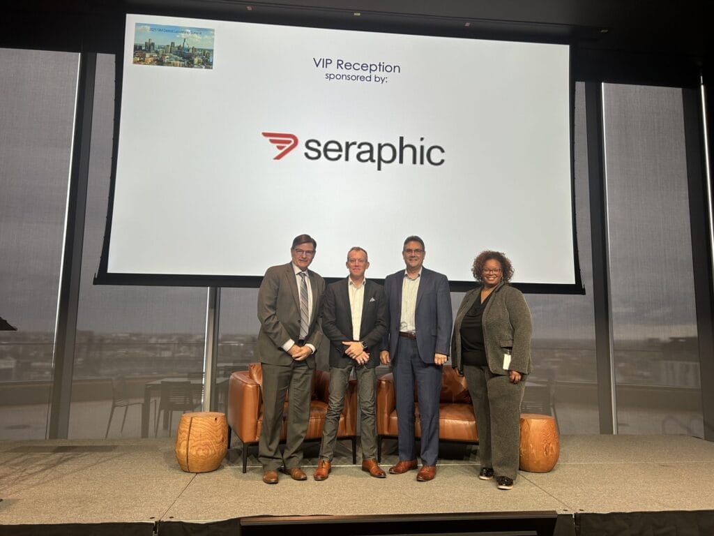 From left, OLHSA CFO Brad Michaud, Apex Digital Solution CEO Jason Lambiris, Forgotten Harvest CIO Michael Butman, and DESC Chief Strategy Officer Carmen Bender pose on stage at the 2025 Fall SIM Detroit Leadership Summit.