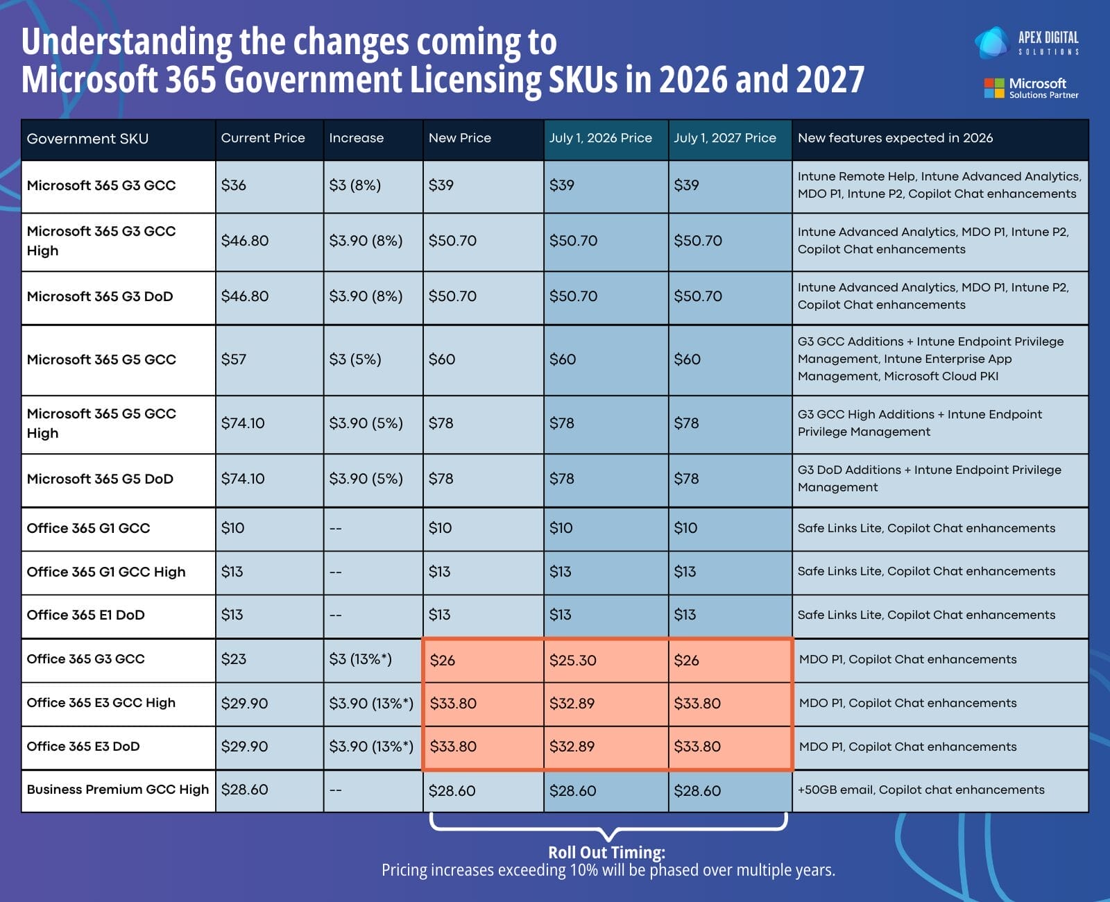 - Office 365 E3 GCC High: $29.90 → $33.80 (+$3.90, 13%)